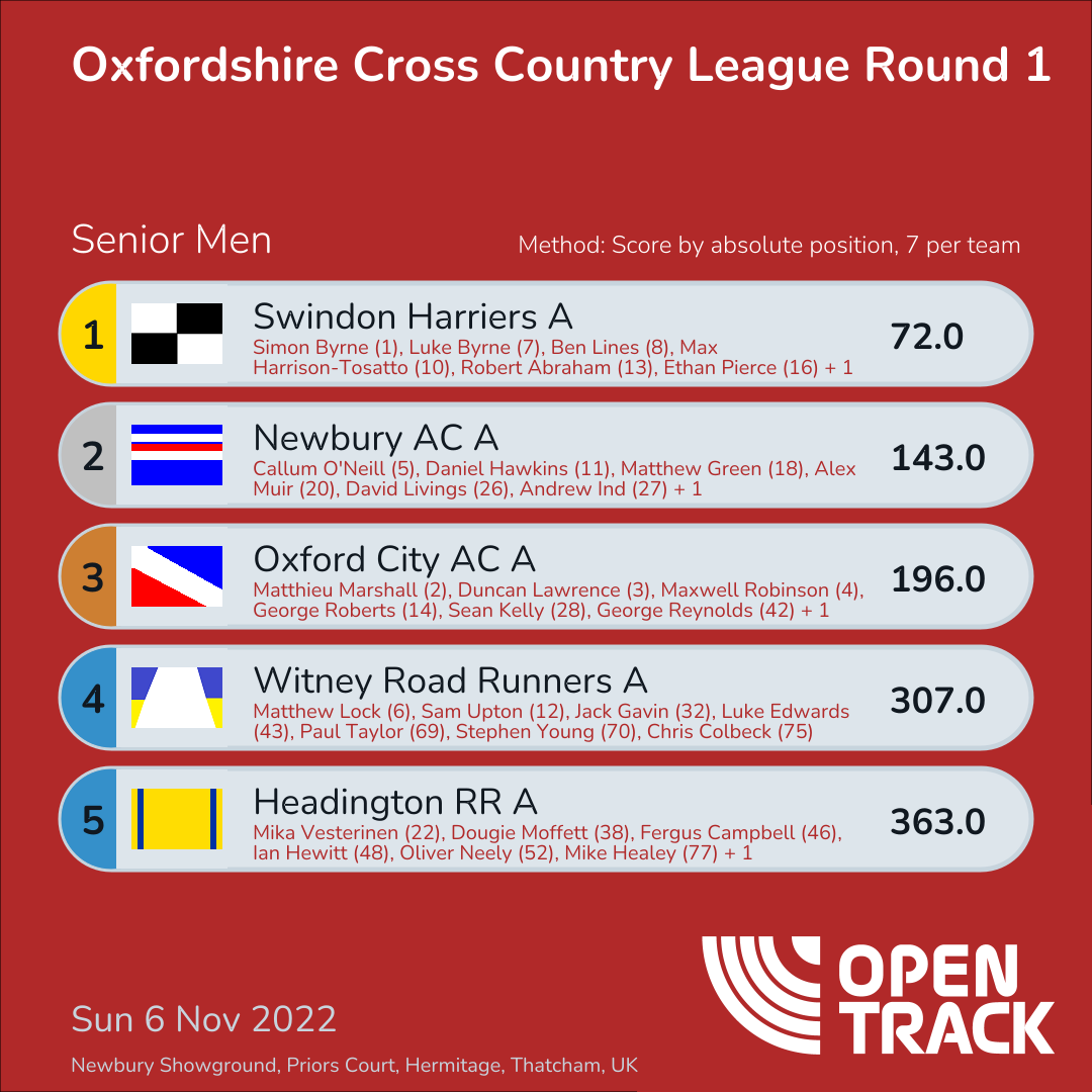| 26 | OXTRI-A | 1390.0 | 72: Alex Thorley (72), 174: Matthew Lawrence (174), 178: Guy Roberts (178), 218: Jamie Hind (218), 233: Robert Ratcliffe (233), 244: Clive Shackell (244), 271: Bernard Calnan (271) | |