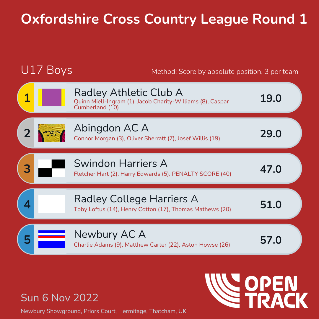 | 4 | RCH-A | 51.0 | 14: Toby Loftus (14), 17: Henry Cotton (17), 20: Thomas Mathews (20) | |