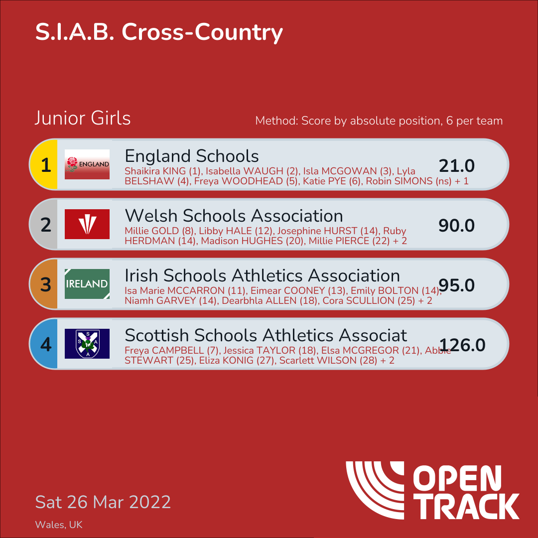 126.0 | 7: Freya CAMPBELL (7), 18: Jessica TAYLOR (18), 21: Elsa MCGREGOR (21), 25: Abbie STEWART (25), 27: Eliza KONIG (27), 28: Scarlett WILSON (28) |