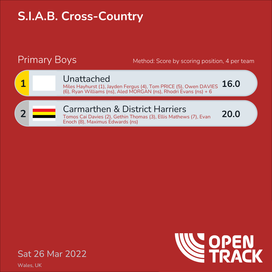 | 2 | CARMA | 20.0 | 4: Tomos Cai Davies (2), 5: Gethin Thomas (3), 9: Ellis Mathews (7), 10: Evan Enoch (8) |