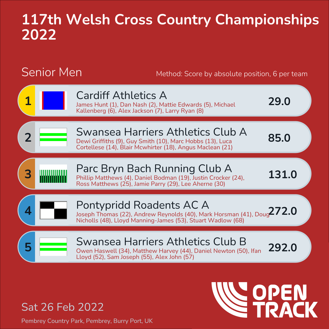 292.0 | 34: Owen Haswell (34), 44: Matthew Harvey (44), 50: Daniel Newton (50), 52: Ifan Lloyd (52), 55: Sam Joseph (55), 57: Alex John (57) | |