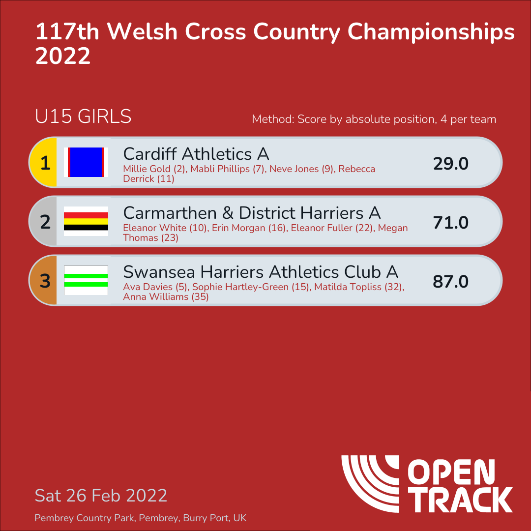 29.0 | 2: Millie Gold (2), 7: Mabli Phillips (7), 9: Neve Jones (9), 11: Rebecca Derrick (11) | |