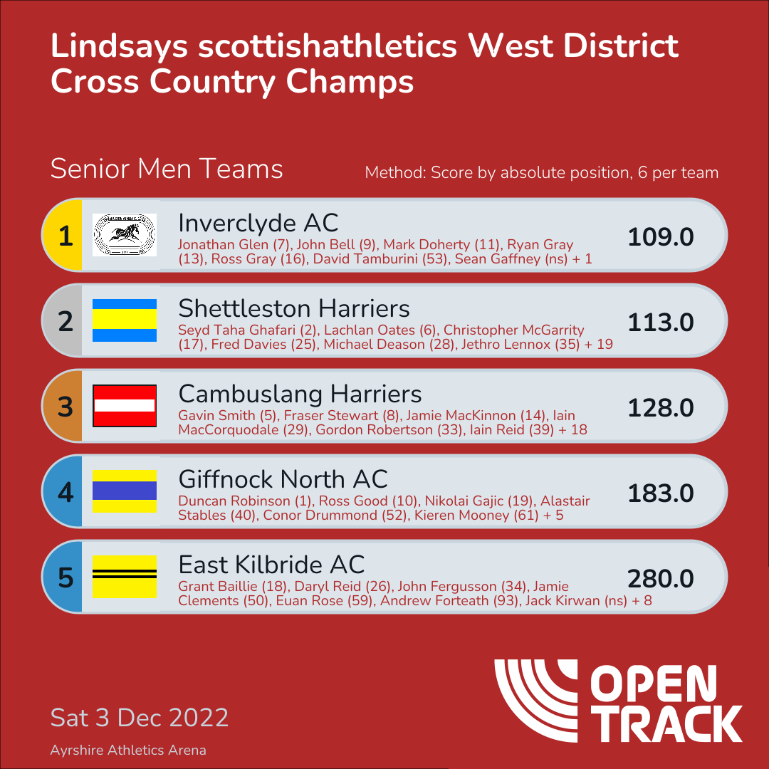 280.0 | 18: Grant Baillie (18), 26: Daryl Reid (26), 34: John Fergusson (34), 50: Jamie Clements (50), 59: Euan Rose (59), 93: Andrew Forteath (93) | |
