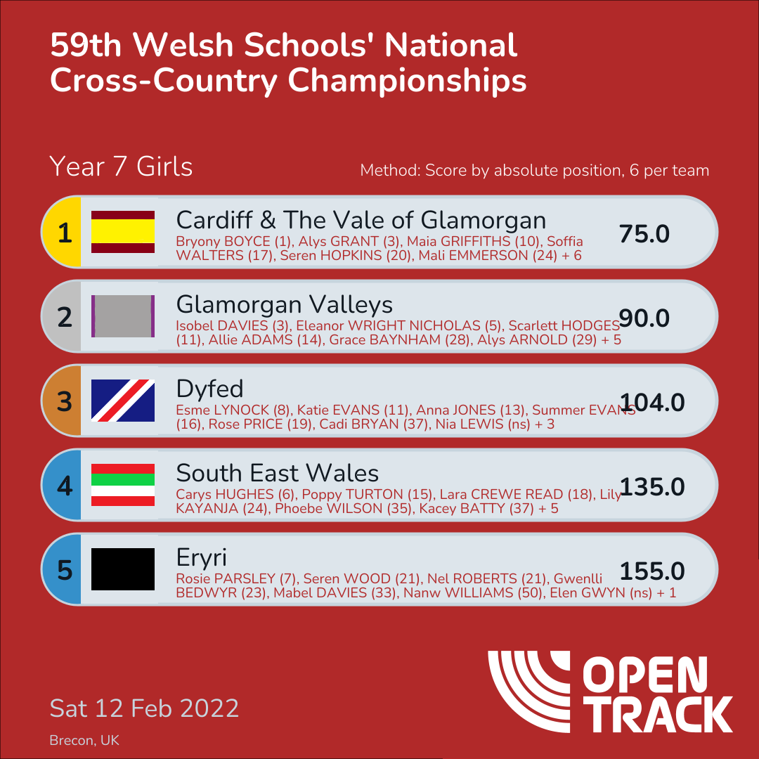 | 5 | ERY | 155.0 | 7: Rosie PARSLEY (7), 21: Seren WOOD (21), 21: Nel ROBERTS (21), 23: Gwenlli BEDWYR (23), 33: Mabel DAVIES (33), 50: Nanw WILLIAMS (50) | |