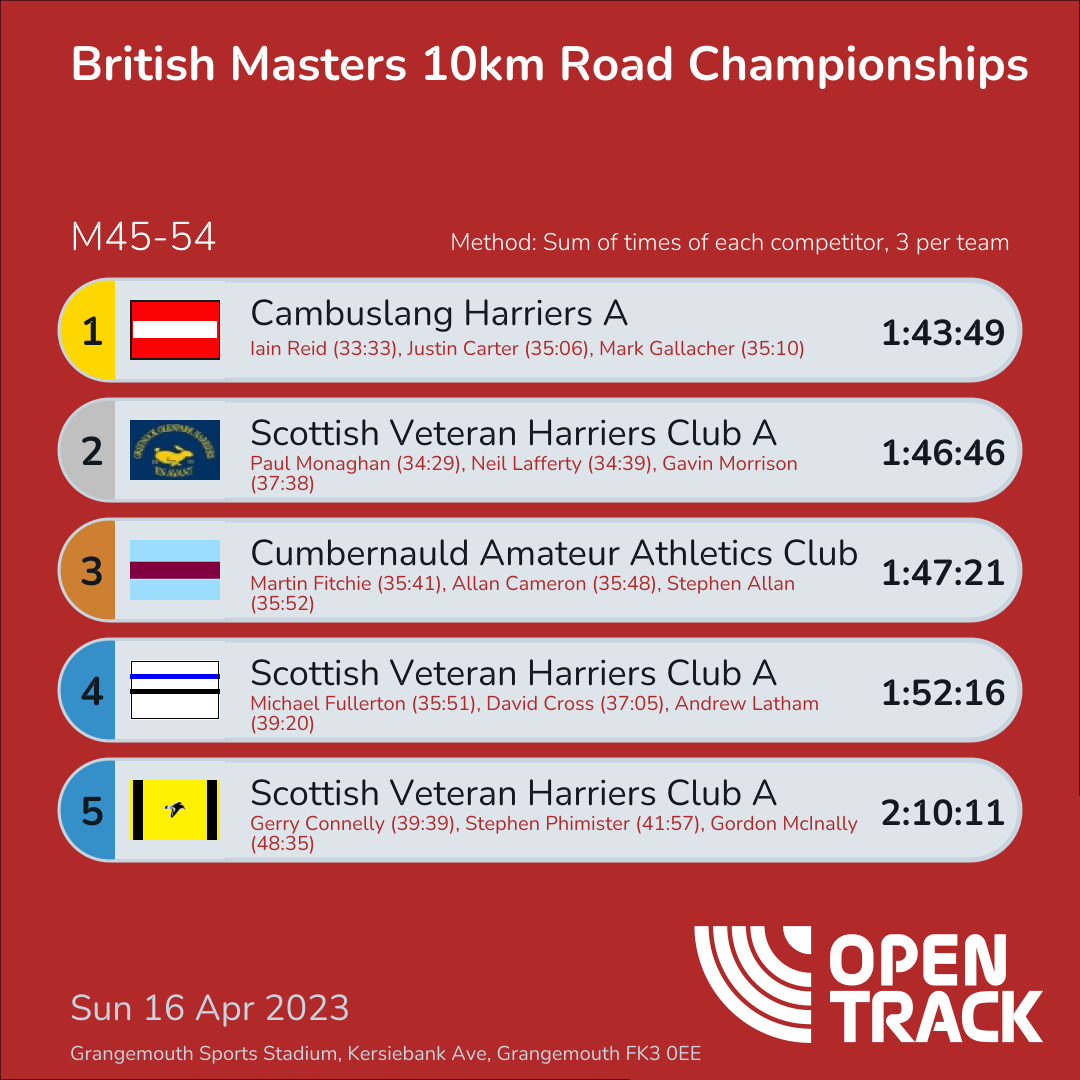 | 4 | EDIN-A | 1:52:16 | 31: Michael Fullerton (35:51), 41: David Cross (37:05), 55: Andrew Latham (39:20) | |