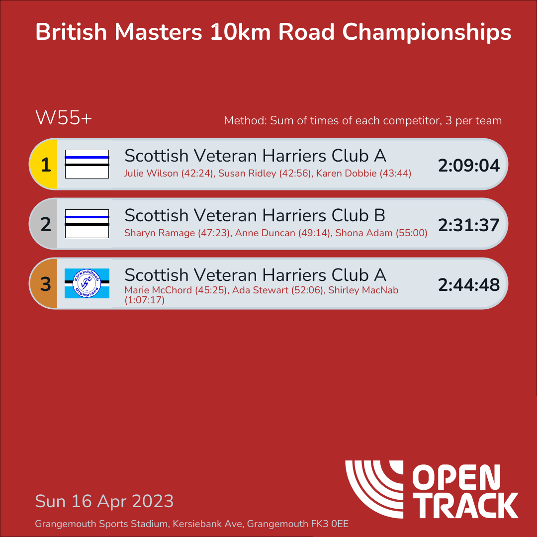 | 2 | EDIN-B | 2:31:37 | 95: Sharyn Ramage (47:23), 102: Anne Duncan (49:14), 117: Shona Adam (55:00) | |
