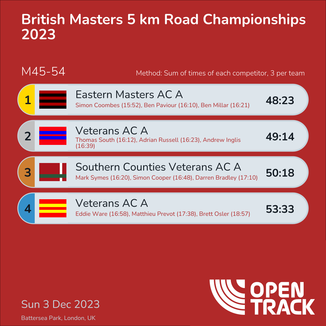 49:14 | 12: Thomas South (16:12), 20: Adrian Russell (16:23), 24: Andrew Inglis (16:39) | |