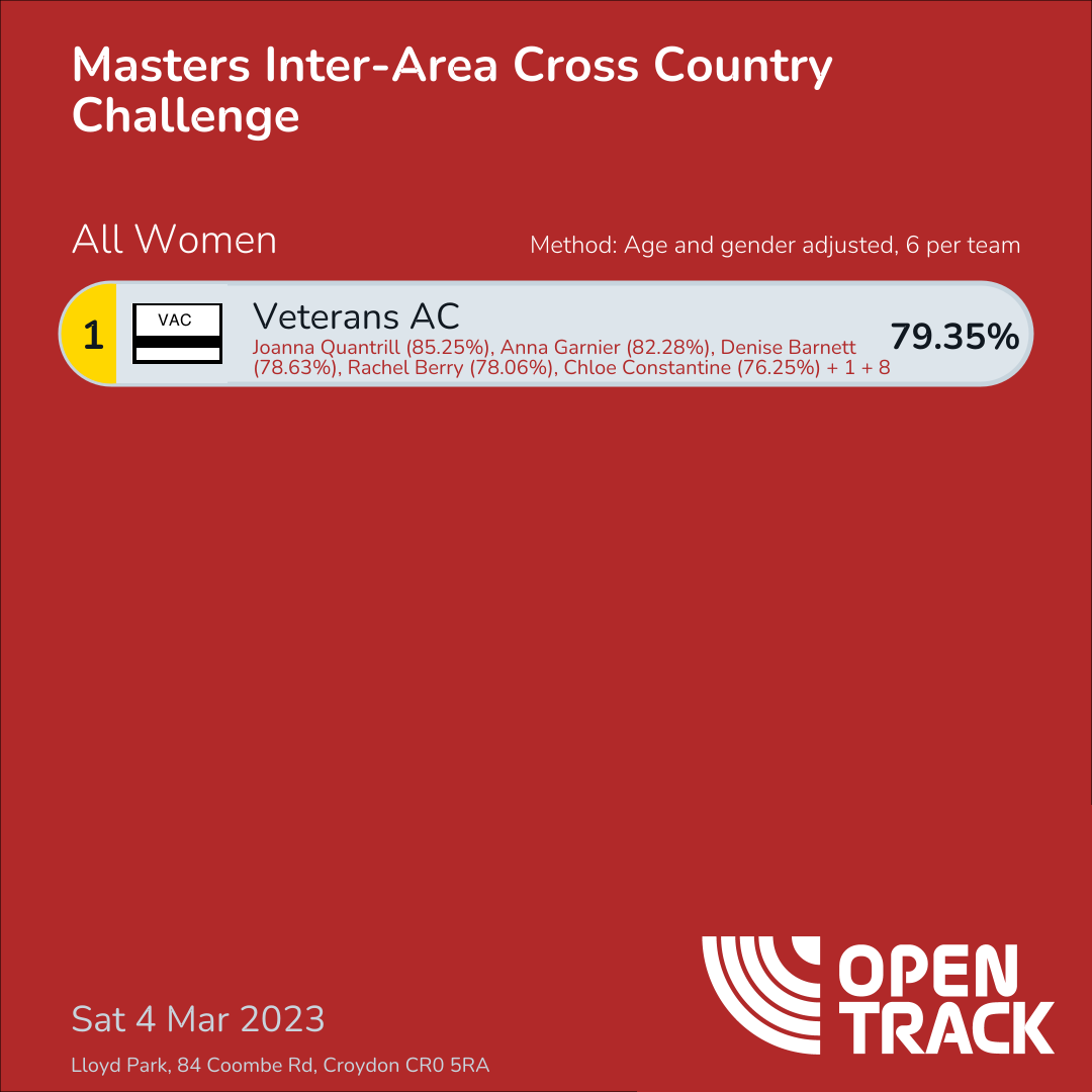 79.35% | 35: Joanna Quantrill (85.25%), 42: Anna Garnier (82.28%), 17: Denise Barnett (78.63%), 21: Rachel Berry (78.06%), 25: Chloe Constantine (76.25%), 34: Pippa Major (75.63%) |
