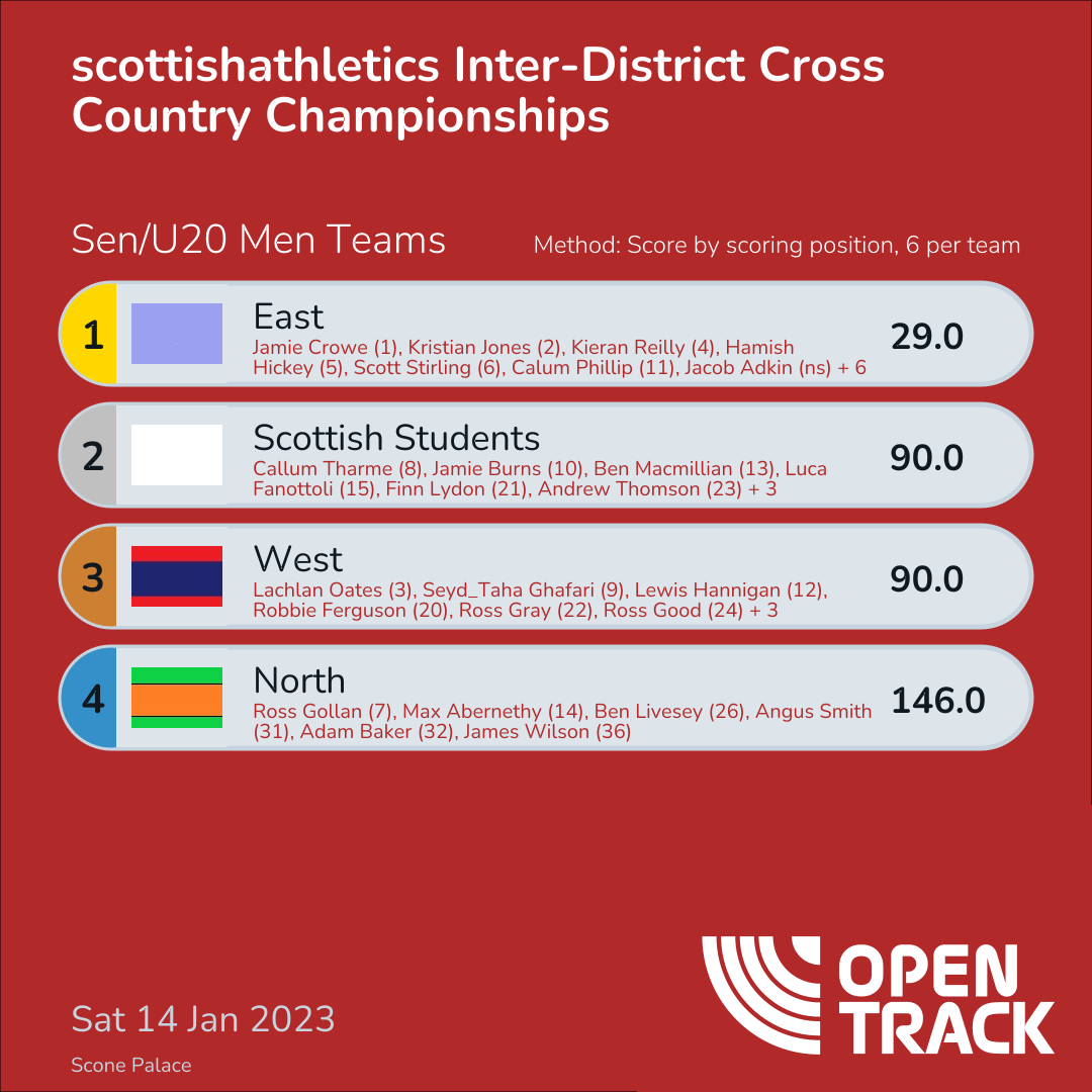 | 1 | EAST | 29.0 | 1: Jamie Crowe (1), 2: Kristian Jones (2), 6: Kieran Reilly (4), 7: Hamish Hickey (5), 8: Scott Stirling (6), 13: Calum Phillip (11) | |