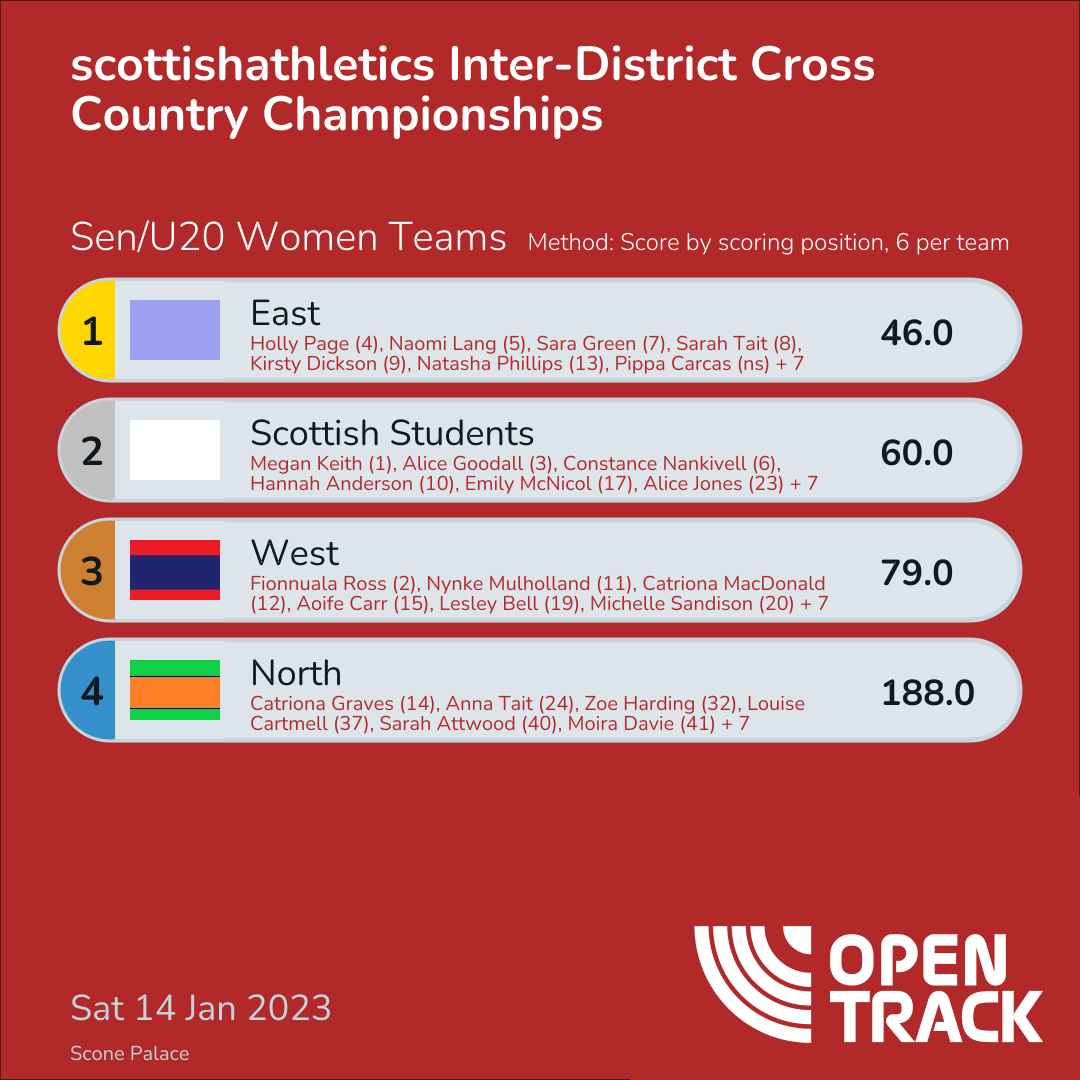 | 1 | EAST | 46.0 | 6: Holly Page (4), 7: Naomi Lang (5), 10: Sara Green (7), 11: Sarah Tait (8), 12: Kirsty Dickson (9), 19: Natasha Phillips (13) | |