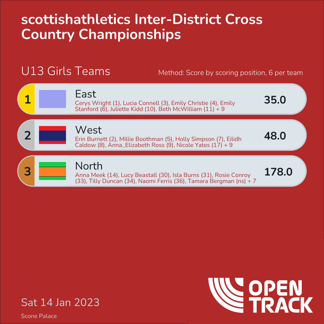 | 1 | EAST | 35.0 | 1: Cerys Wright (1), 4: Lucia Connell (3), 5: Emily Christie (4), 7: Emily Stanford (6), 12: Juliette Kidd (10), 13: Beth McWilliam (11) | |