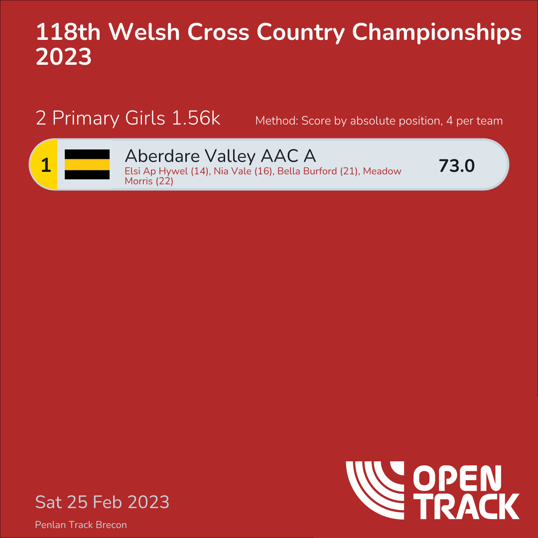 73.0 | 14: Elsi Ap Hywel (14), 16: Nia Vale (16), 21: Bella Burford (21), 22: Meadow Morris (22) |