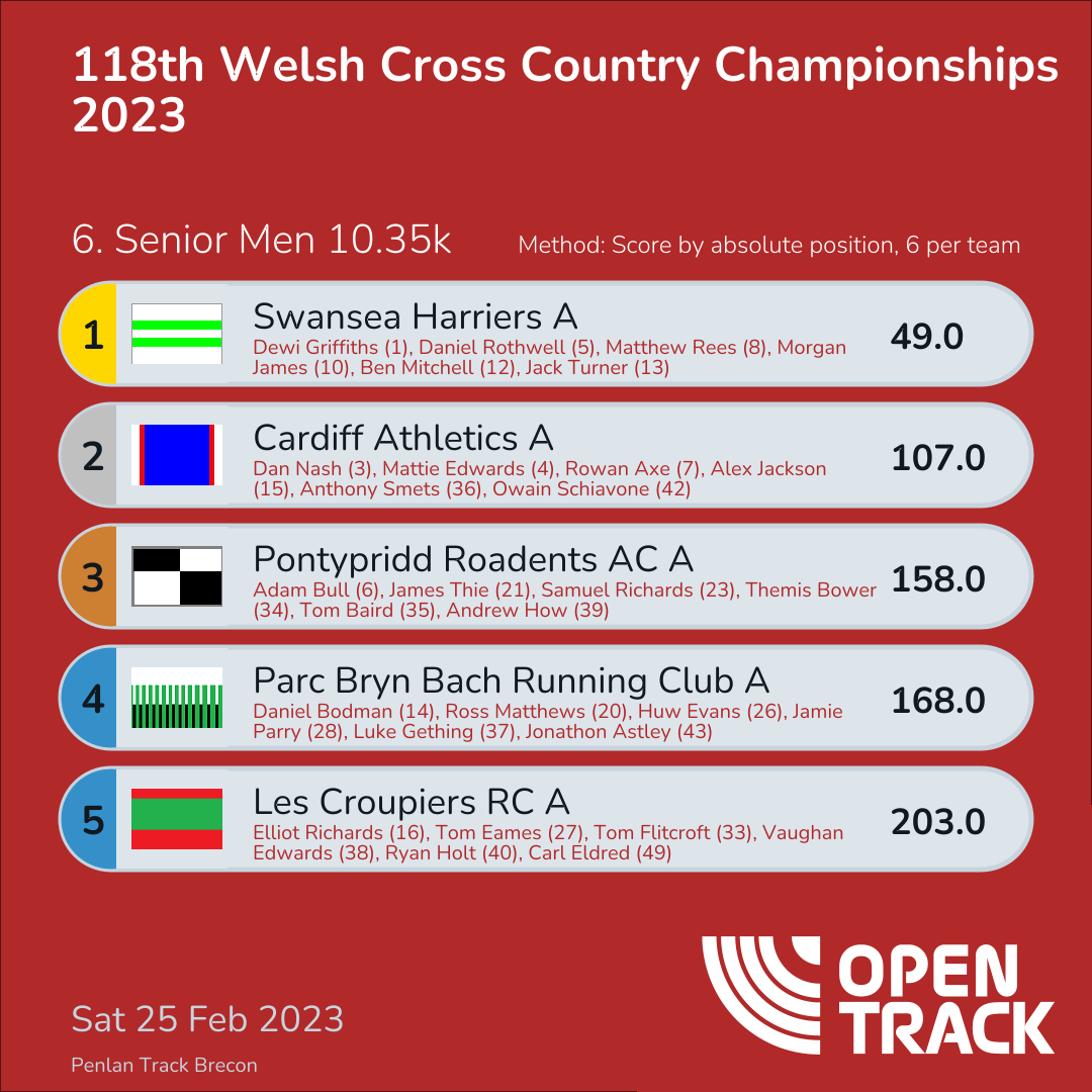 436.0 | 52: Sam Joseph (52), 55: Morgan Davies (55), 64: Charles Walsh (64), 70: Matthew Richards (70), 97: Owen Davies (97), 98: Simon Brewer (98) | |