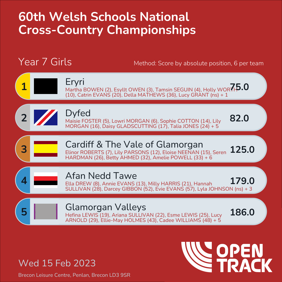 | 1 | ERY | 75.0 | 2: Martha BOWEN (2), 3: Esyllt OWEN (3), 4: Tamsin SEGUIN (4), 10: Holly WORTH (10), 20: Catrin EVANS (20), 36: Della MATHEWS (36) | |