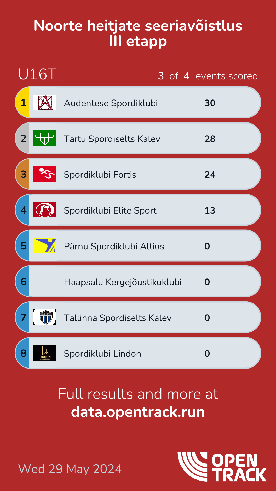 - Winner AUDE: 30 (Scored 3 out of 4 events) (click to show results)| Team: | AUDE | TARTU | FORT | ELITE | ALT | HAAPS | KALEV | LIND | NARVI | NIIDU | NOMME | SAKAL | SAUE |