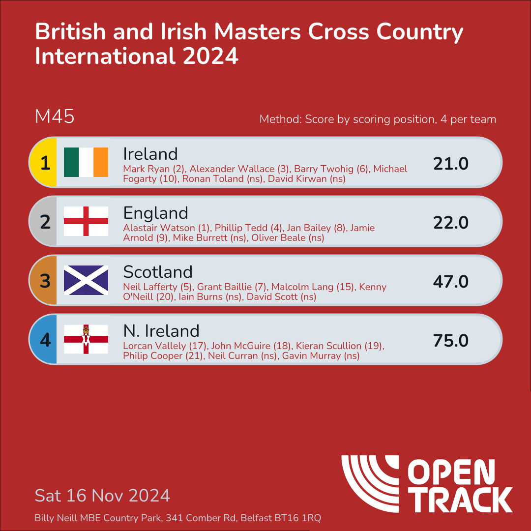 75.0 | 67: Lorcan Vallely (17), 68: John McGuire (18), 69: Kieran Scullion (19), 72: Philip Cooper (21) |