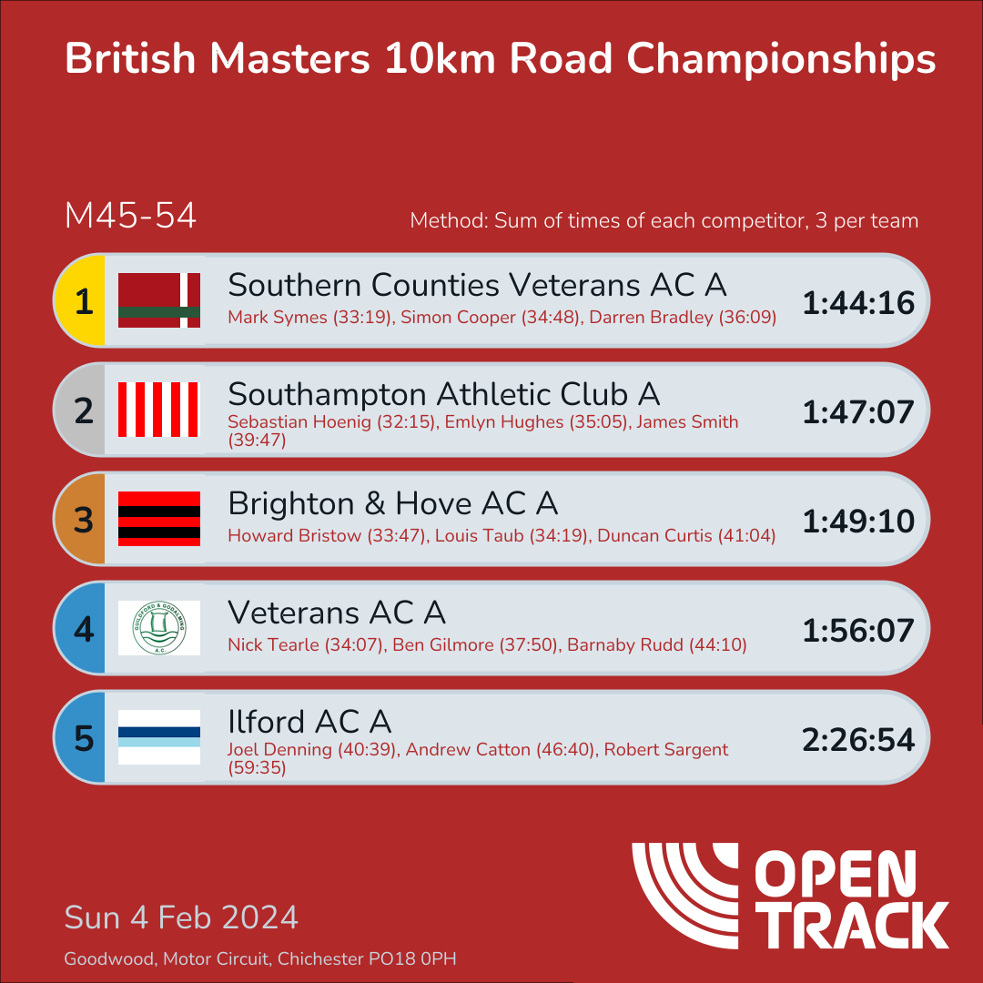 | 1 | AFD-A | 1:44:16 | 26: Mark Symes (33:19), 43: Simon Cooper (34:48), 59: Darren Bradley (36:09) | |