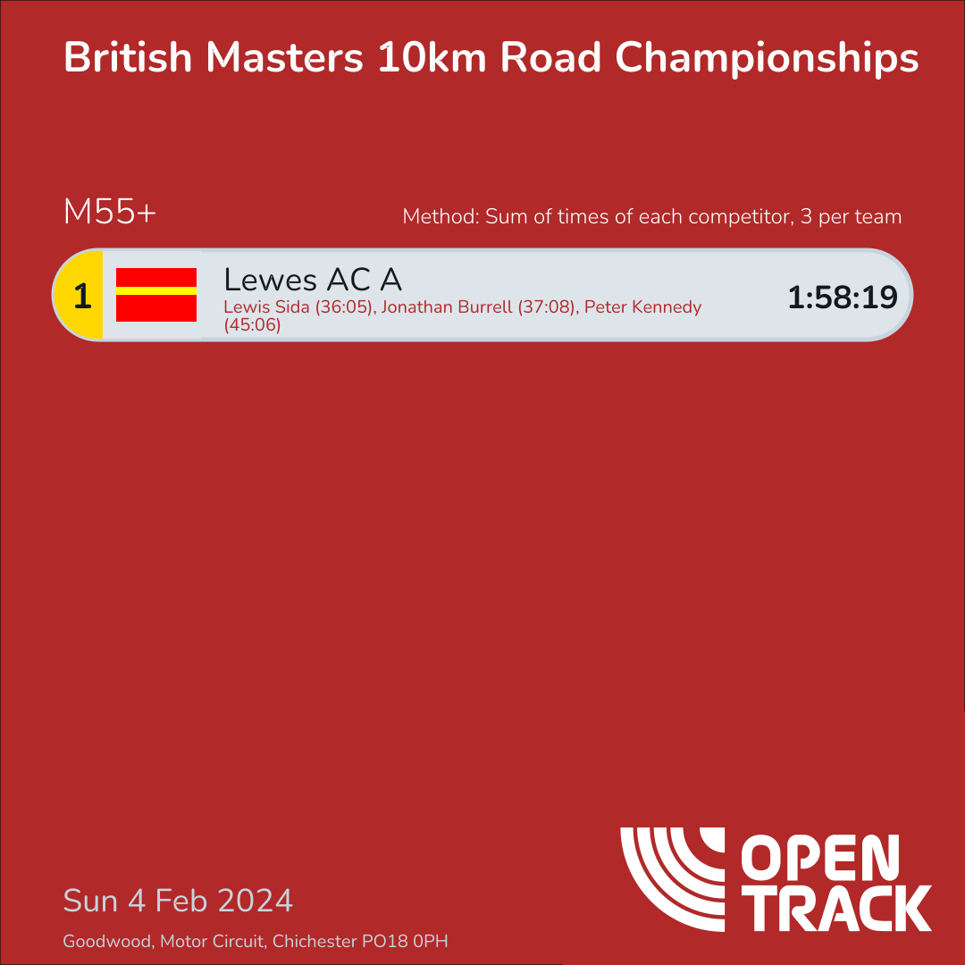 | 1 | LEWES-A | 1:58:19 | 56: Lewis Sida (36:05), 71: Jonathan Burrell (37:08), 164: Peter Kennedy (45:06) |