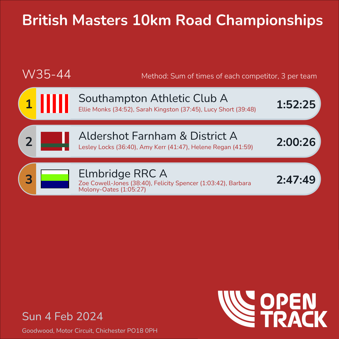 | 1 | SOTON-A | 1:52:25 | 44: Ellie Monks (34:52), 83: Sarah Kingston (37:45), 112: Lucy Short (39:48) | |