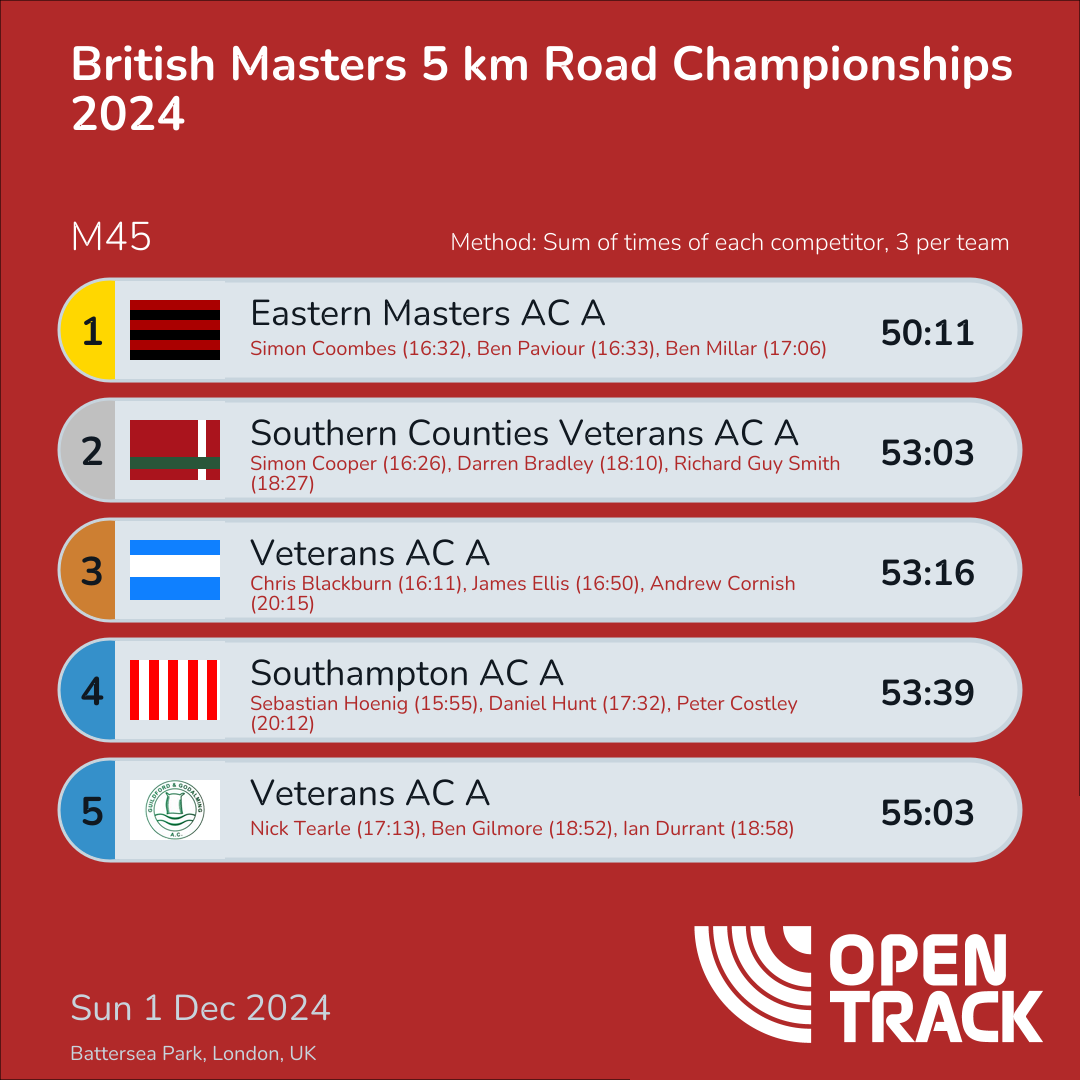 | 5 | GG-A | 55:03 | 43: Nick Tearle (17:13), 101: Ben Gilmore (18:52), 107: Ian Durrant (18:58) | |
