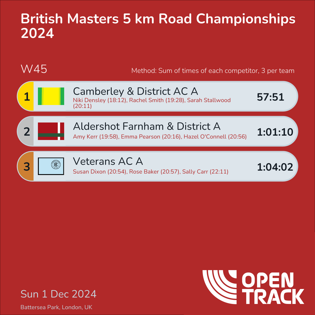 | 3 | CAMBH-A | 1:04:02 | 156: Susan Dixon (20:54), 158: Rose Baker (20:57), 177: Sally Carr (22:11) |