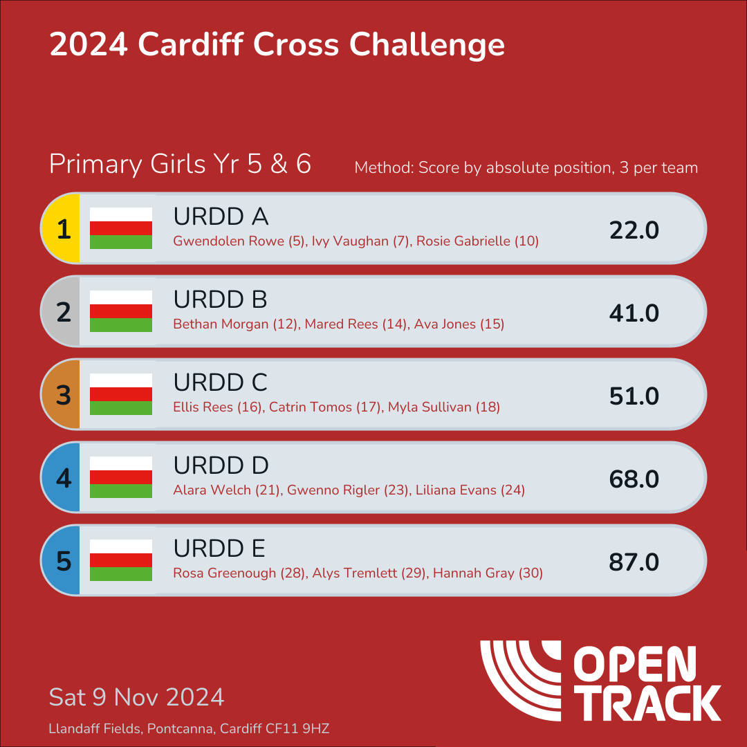 | 2 | URDD-B | 41.0 | 12: Bethan Morgan (12), 14: Mared Rees (14), 15: Ava Jones (15) | |