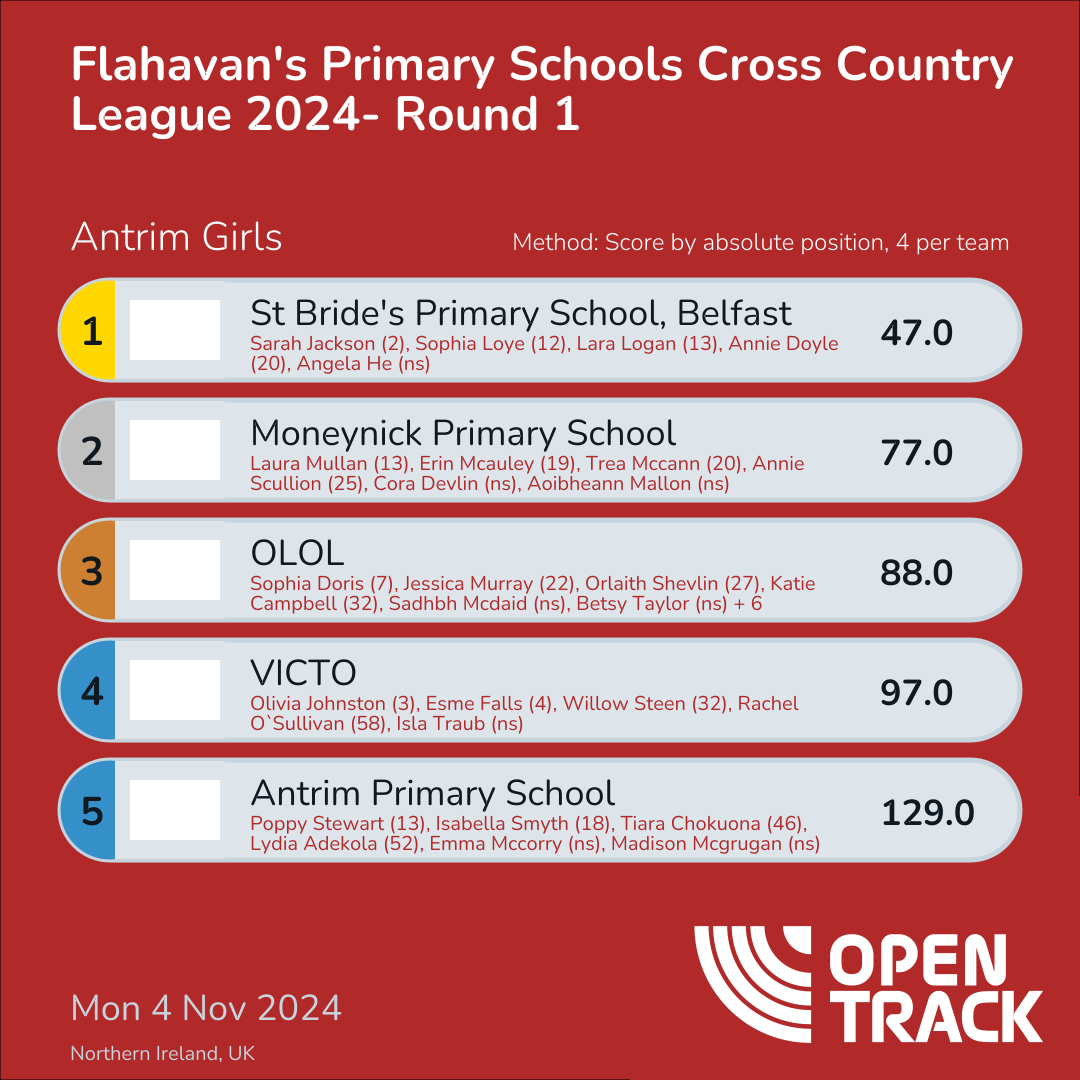 132.0 | 13: Emma Wylie (13), 22: Sophie Scullion (22), 47: Anna Ewings (47), 50: Ella Magee (50) | |