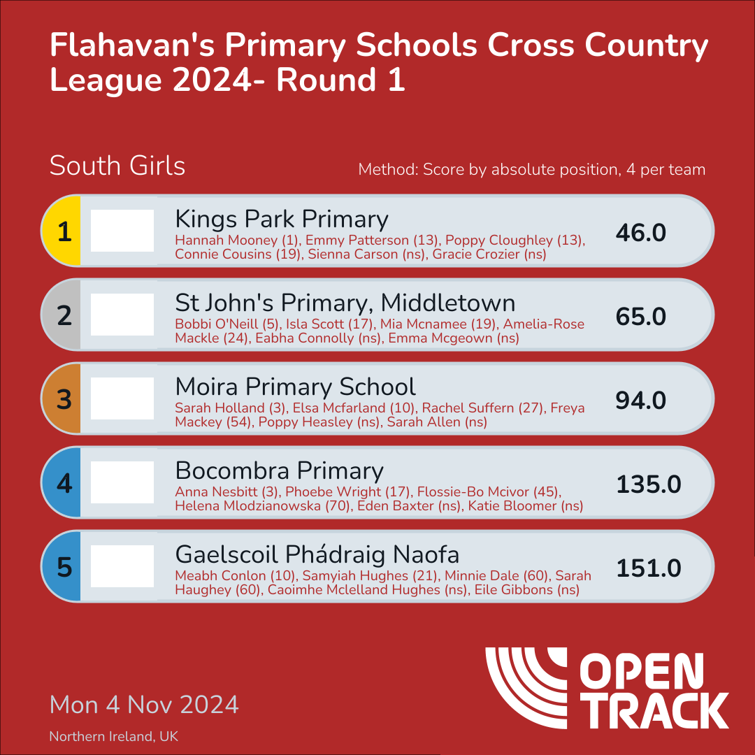 217.0 | 6: Lucy Best (6), 45: Evie Ferris (45), 77: Isla Whiteside (77), 89: Emma Flemming (89) | |