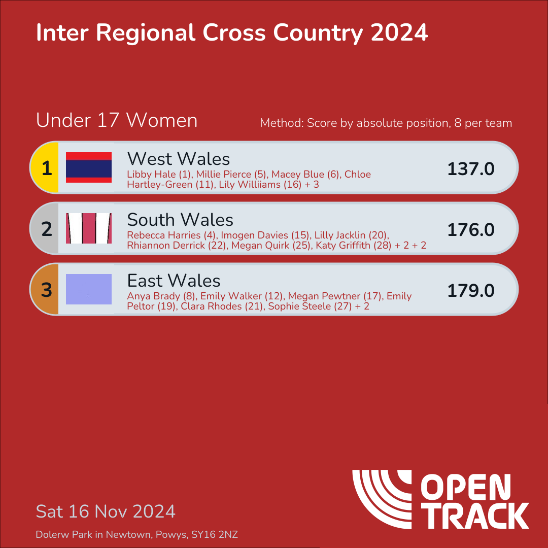 176.0 | 4: Rebecca Harries (4), 15: Imogen Davies (15), 20: Lilly Jacklin (20), 22: Rhiannon Derrick (22), 25: Megan Quirk (25), 28: Katy Griffith (28), 29: Grace Griffiths (29), 33: Isabelle Lewis (33) | |