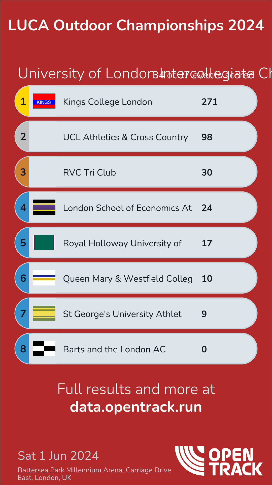 - Winner UKCL: 271 (Scored 34 out of 37 events) (click to show results)| Team: | UKCL | UCLAC | RVC | LSE | ROHOL | QMWC | SGUL | BARTS | GOLDU | SOAS | UBRUN |