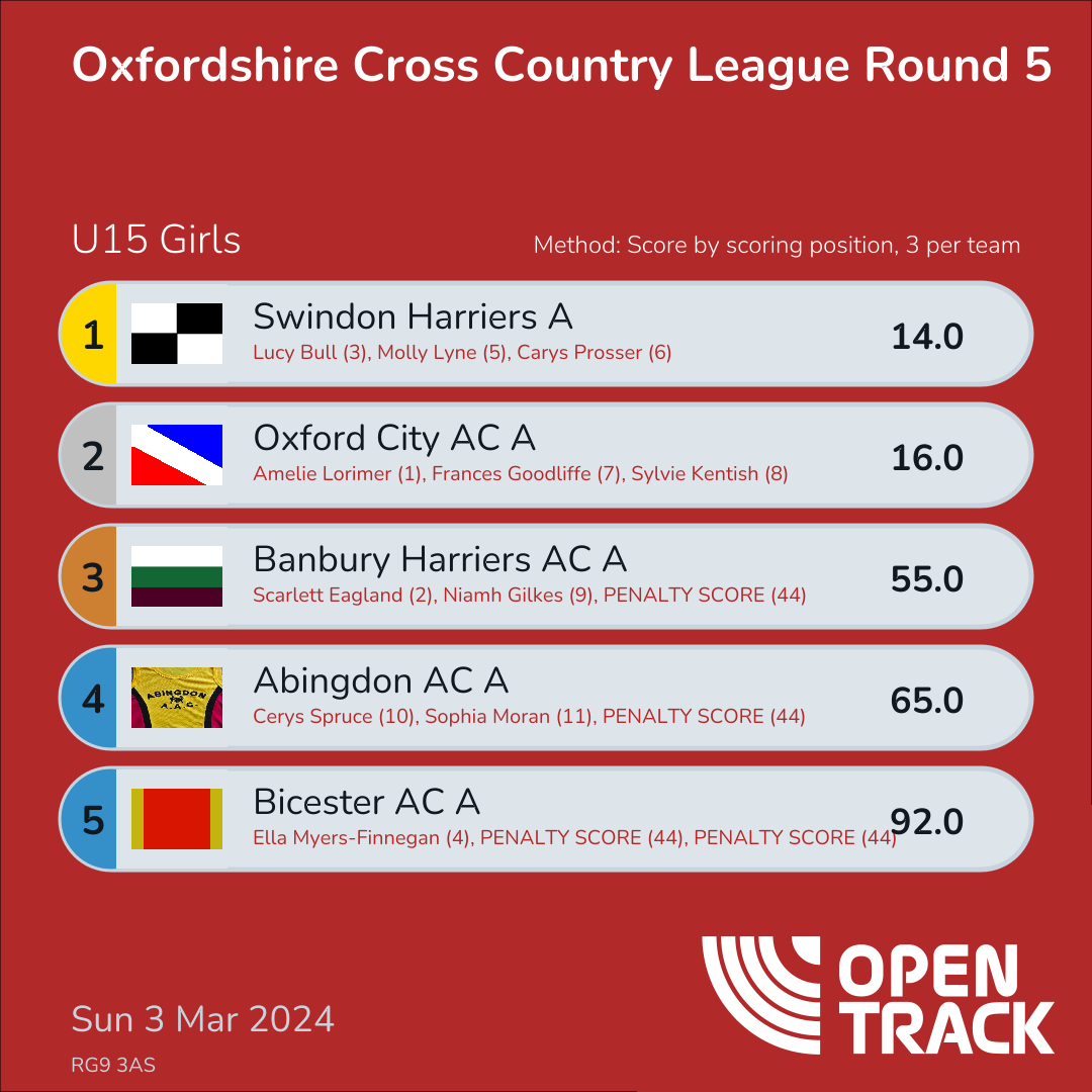 | 5 | BIC-A | 92.0 | 31: Ella Myers-Finnegan (4), 44: PENALTY SCORE (44), 44: PENALTY SCORE (44) | |