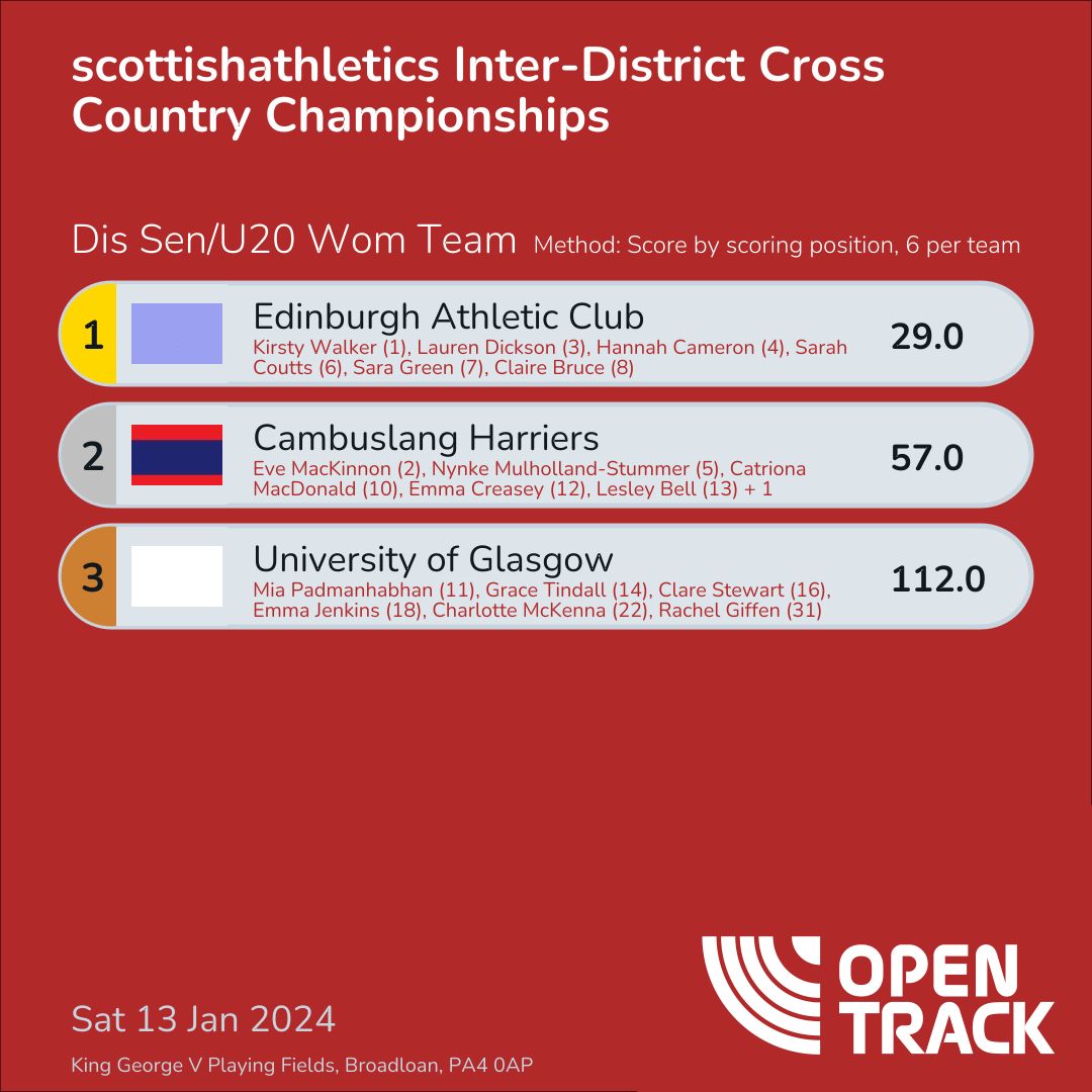 | 2 | WEST | 57.0 | 4: Eve MacKinnon (2), 9: Nynke Mulholland-Stummer (5), 15: Catriona MacDonald (10), 17: Emma Creasey (12), 19: Lesley Bell (13), 21: Monica Blair (15) | |