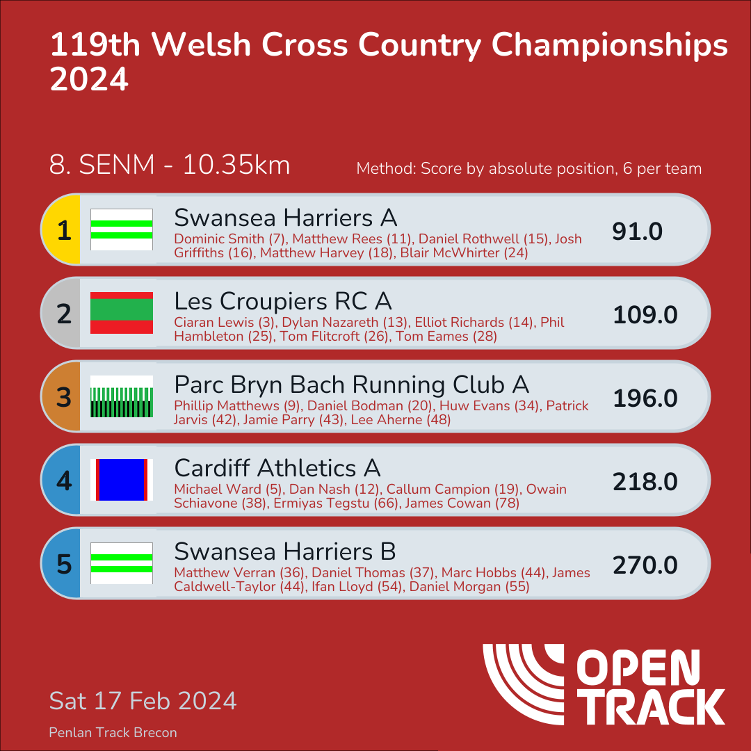300.0 | 33: Edward Foster (33), 40: Vaughan Edwards (40), 50: Edward Davies (50), 56: Owain Zerilli (56), 59: Patrick McDowell (59), 62: Ben Kennedy (62) | |
