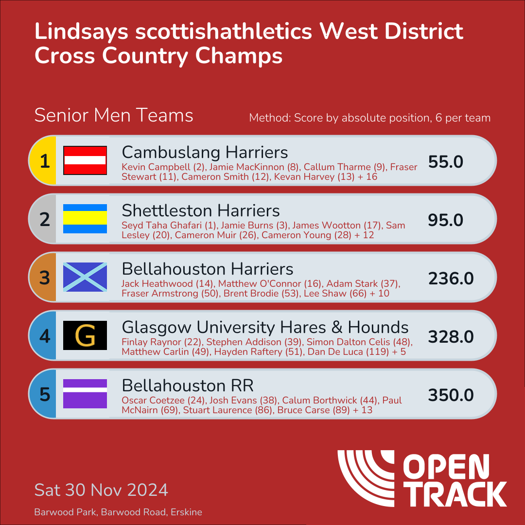 385.0 | 19: John Fergusson (19), 34: Patrick Mochan (34), 42: Jack Kirwan (42), 61: Euan Rose (61), 113: David Gorman (113), 116: Jamie Clements (116) | |