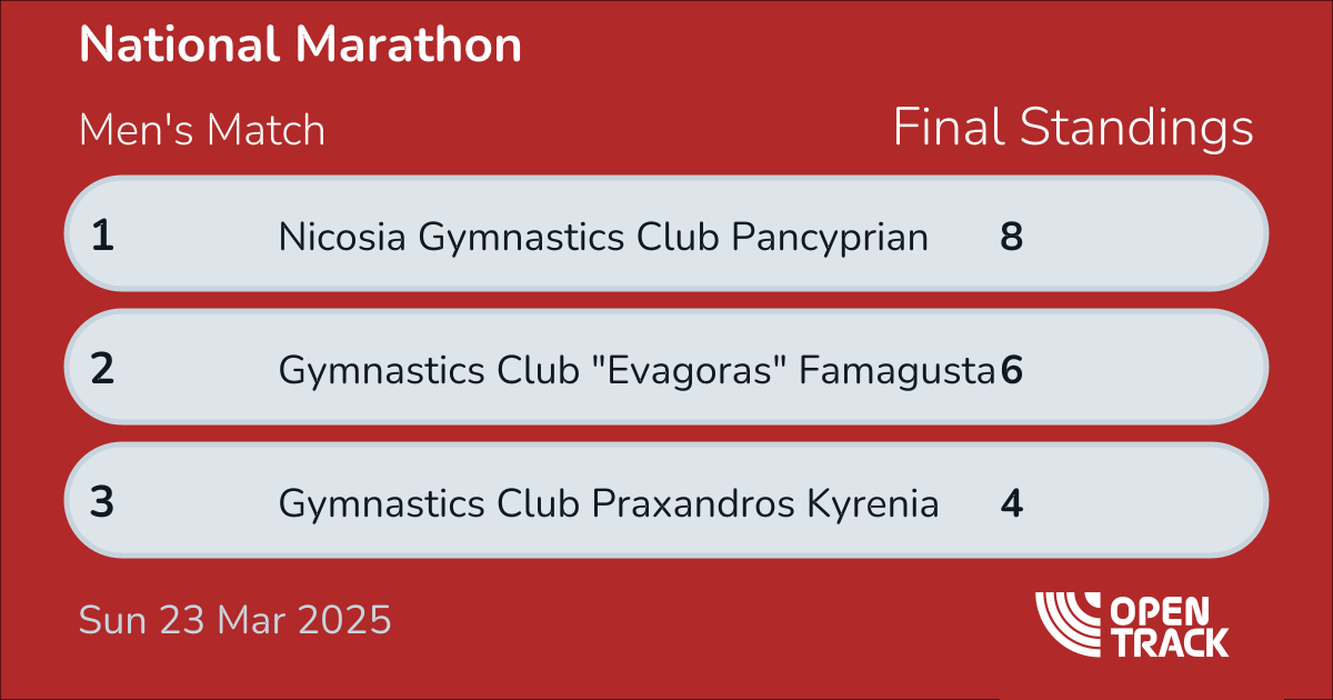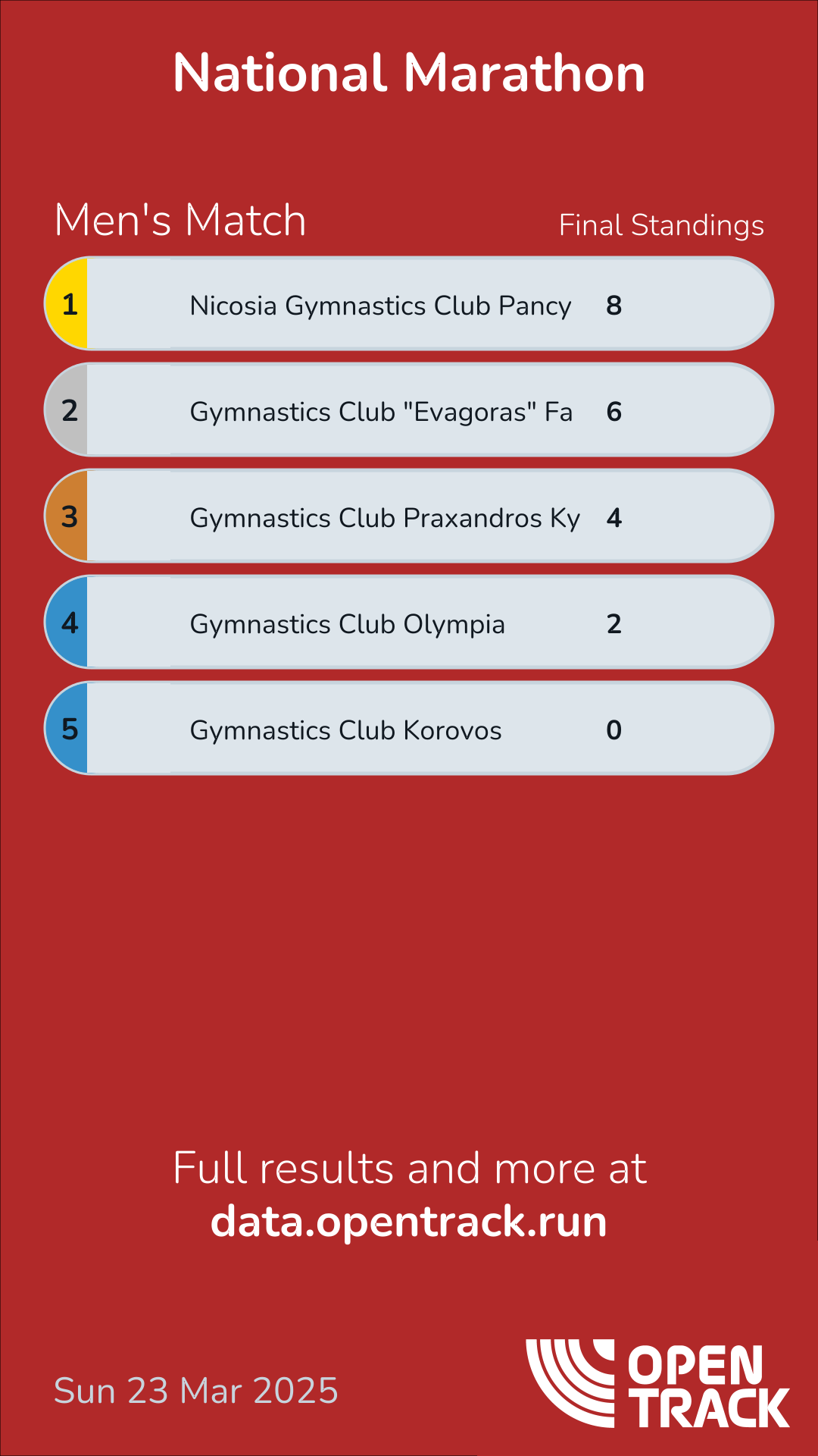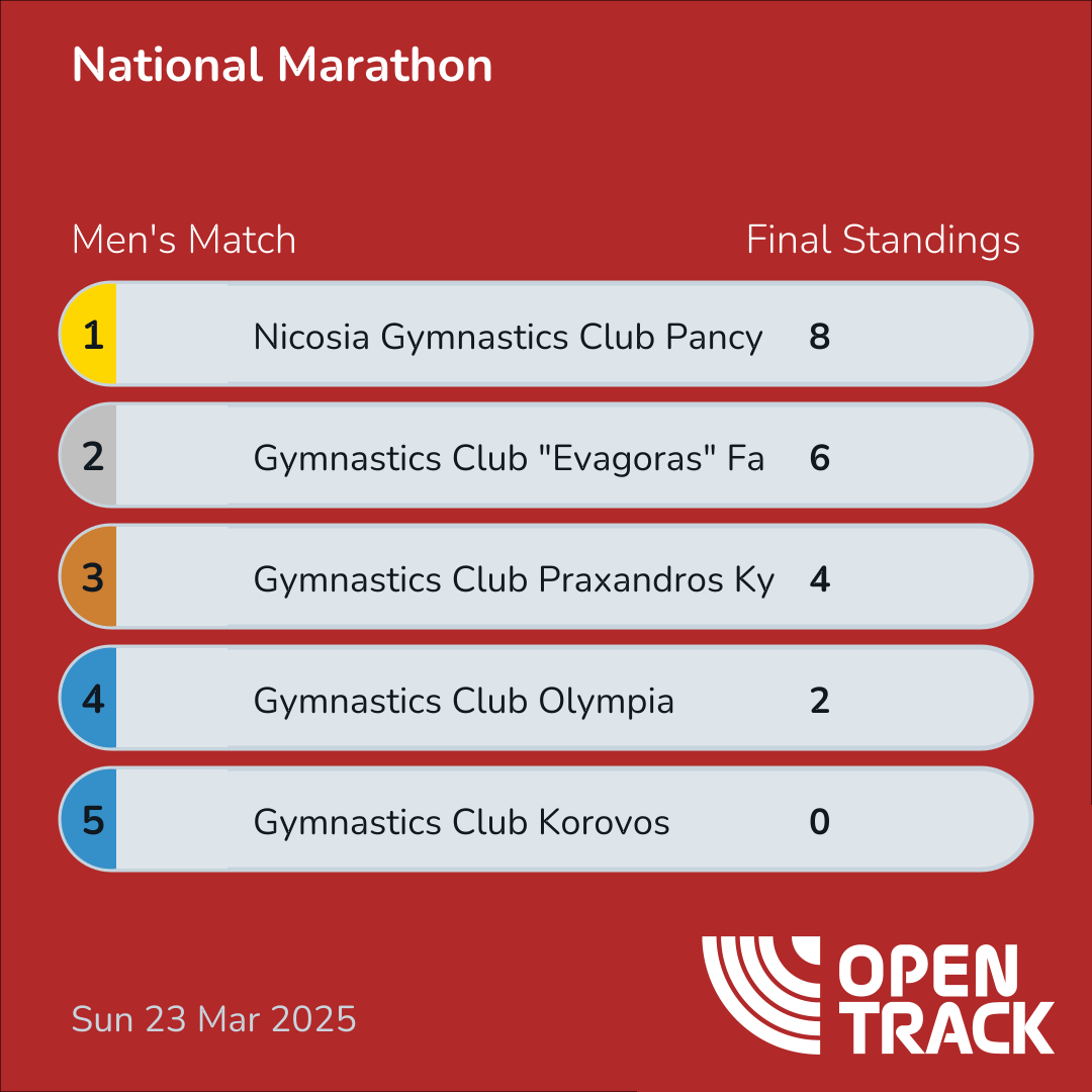 | Μαραθώνιος Ανδρών | 8 | 6 | 4 | 2 | 0 |