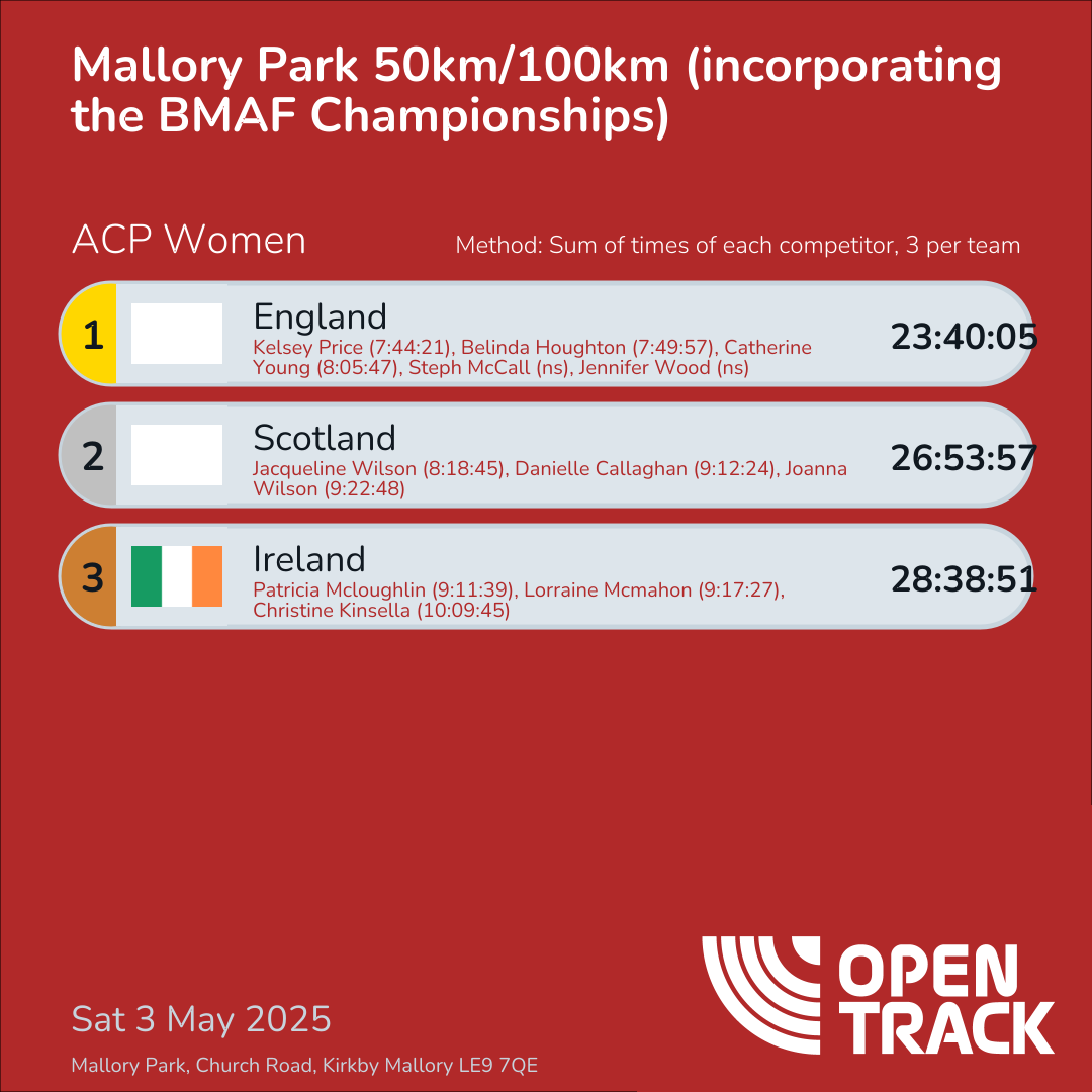 23:40:05 | 13: Kelsey Price (7:44:21), 16: Belinda Houghton (7:49:57), 19: Catherine Young (8:05:47) | |