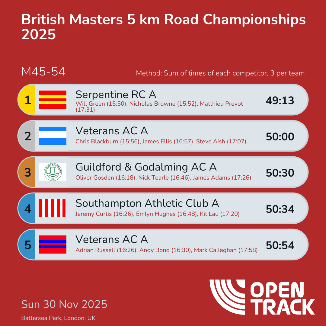 | 3 | GG-A | 50:30 | 20: Oliver Gosden (16:18), 47: Nick Tearle (16:46), 78: James Adams (17:26) | |