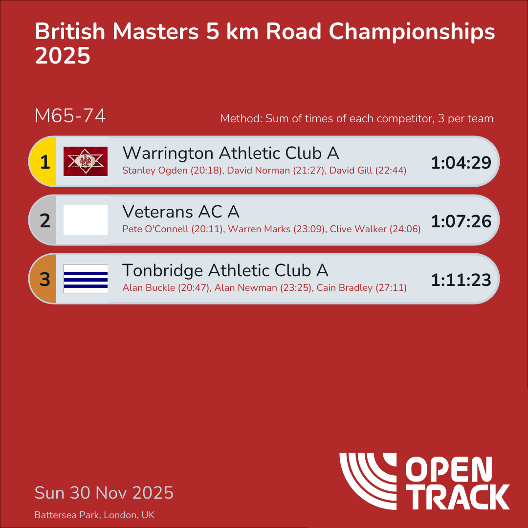 | 1 | WARRA-A | 1:04:29 | 56: Stanley Ogden (20:18), 91: David Norman (21:27), 113: David Gill (22:44) | |