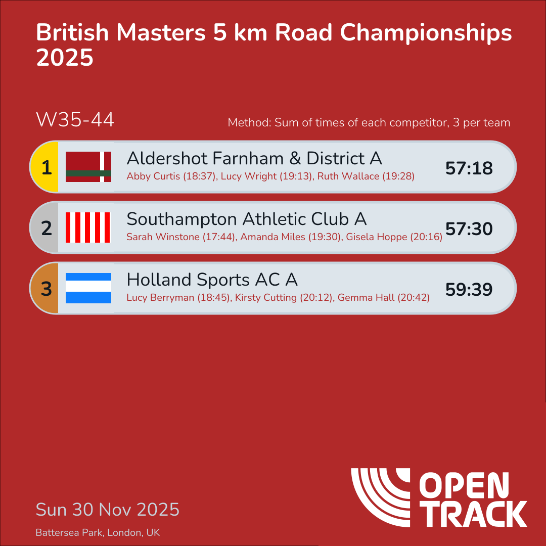 | 3 | HOL-A | 59:39 | 19: Lucy Berryman (18:45), 48: Kirsty Cutting (20:12), 70: Gemma Hall (20:42) |