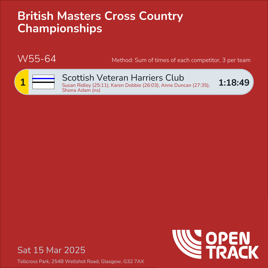 1:18:49 | 33: Susan Ridley (25:11), 41: Karen Dobbie (26:03), 51: Anne Duncan (27:35) |