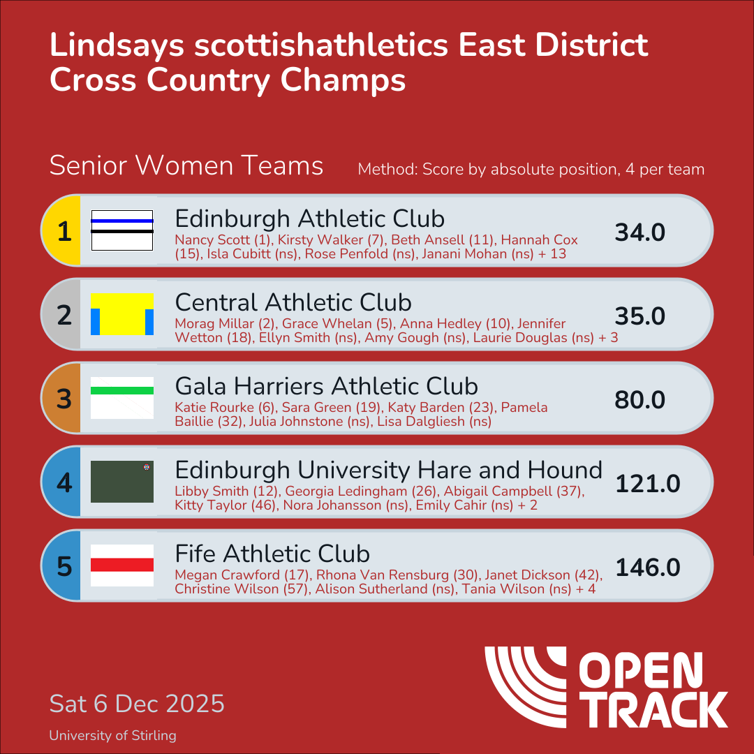 239.0 | 14: Freya Ross (14), 44: Katie Christie (44), 73: Eilidh McCallum (73), 108: Janet Murray (108) | |