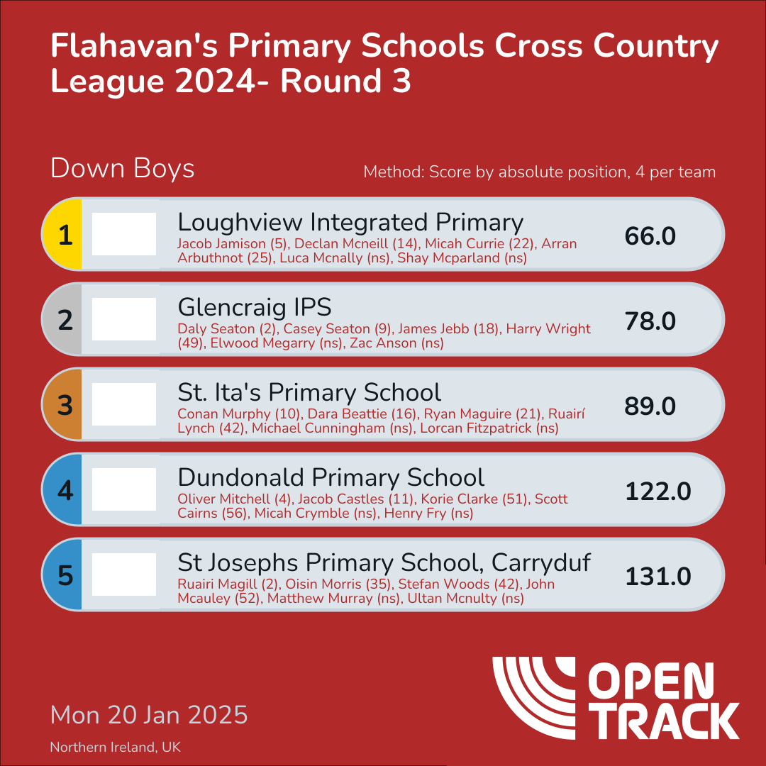330.0 | 72: Eoin Mcalister (72), 74: Luke Mccullough (74), 87: Lewis Mcvickers (87), 97: Tyler Creaney (97) | |