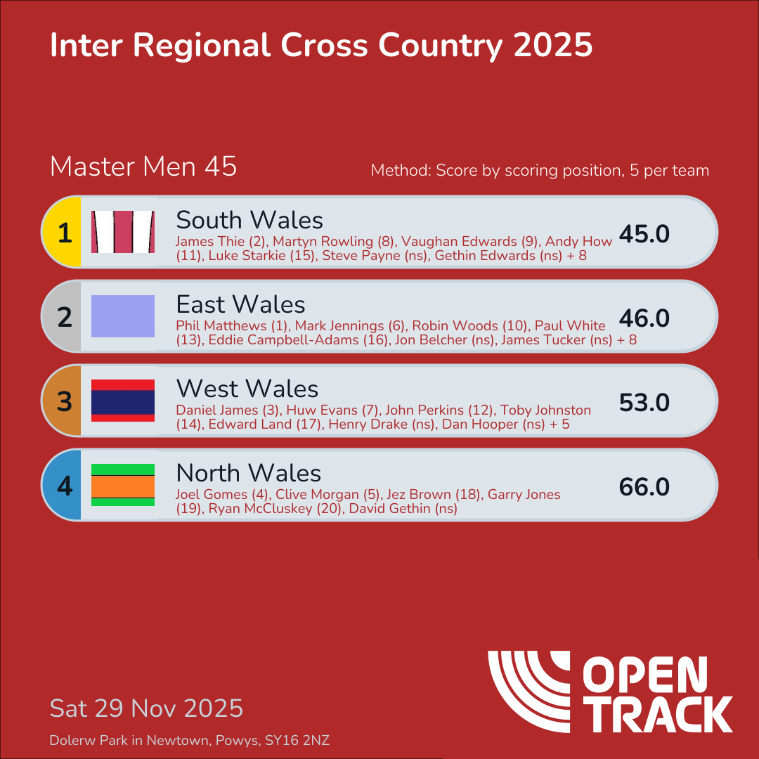 45.0 | 16: James Thie (2), 29: Martyn Rowling (8), 31: Vaughan Edwards (9), 43: Andy How (11), 61: Luke Starkie (15) | |