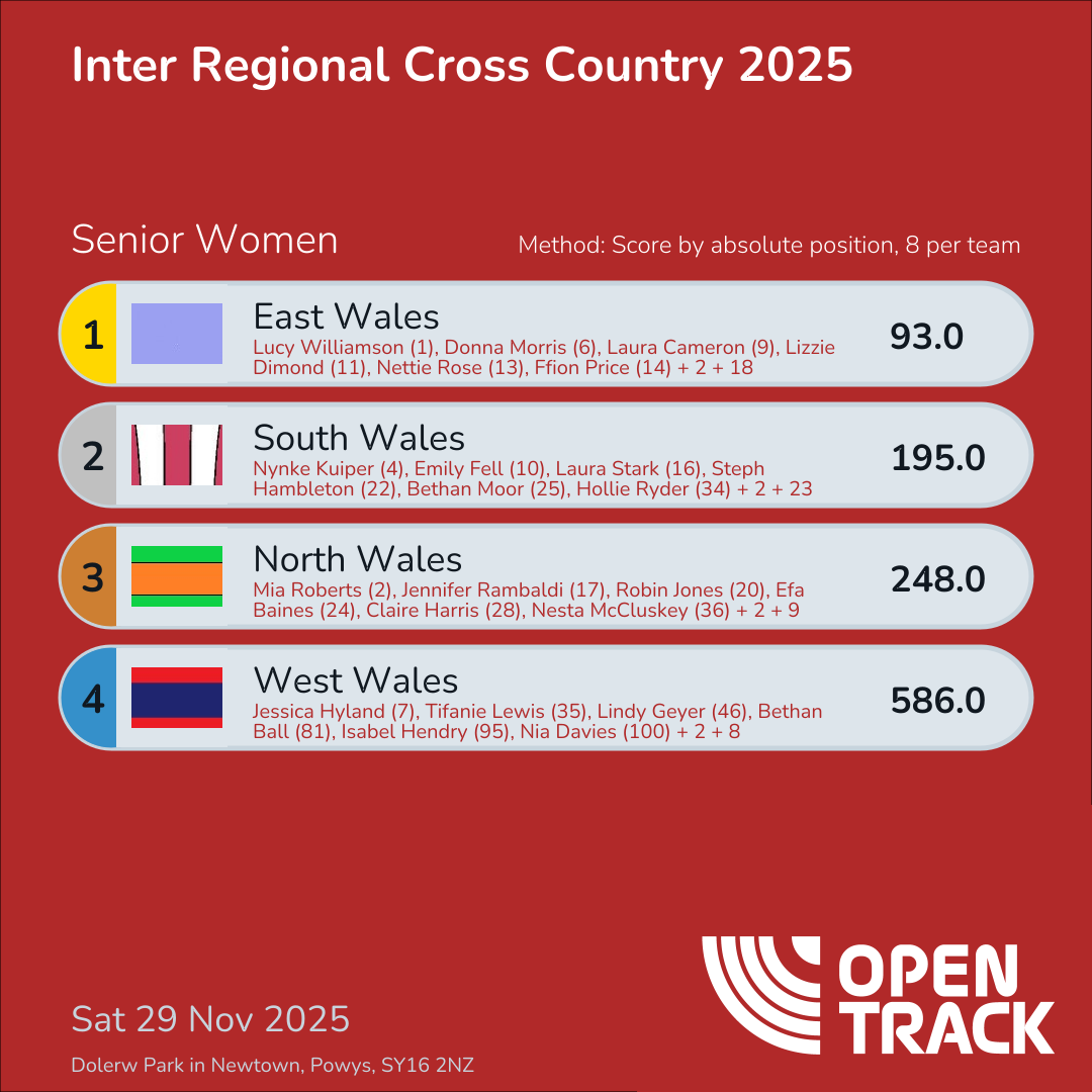 586.0 | 7: Jessica Hyland (7), 35: Tifanie Lewis (35), 46: Lindy Geyer (46), 81: Bethan Ball (81), 95: Isabel Hendry (95), 100: Nia Davies (100), 107: Felicity Jones (107), 115: Catherine Bleasdale (115) |