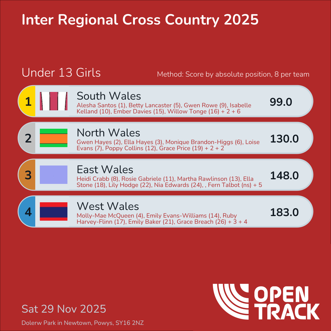 183.0 | 4: Molly-Mae McQueen (4), 14: Emily Evans-Williams (14), 17: Ruby Harvey-Flinn (17), 21: Emily Baker (21), 26: Grace Breach (26), 30: Freya Williams (30), 35: Isabelle Watson (35), 36: Megan Hughes (36) |