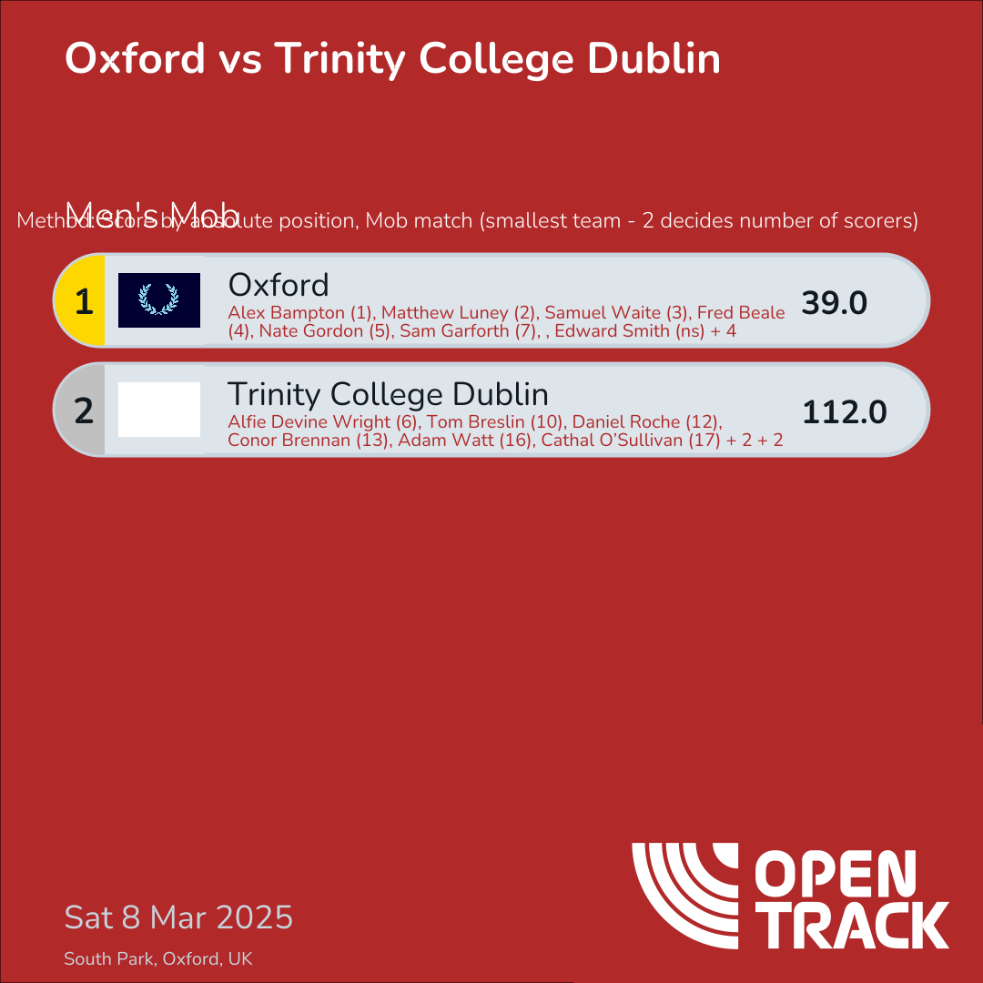 39.0 | 1: Alex Bampton (1), 2: Matthew Luney (2), 3: Samuel Waite (3), 4: Fred Beale (4), 5: Nate Gordon (5), 7: Sam Garforth (7), 8: Daniel Radford-Smith (8), 9: George Chamberlain (9) | |