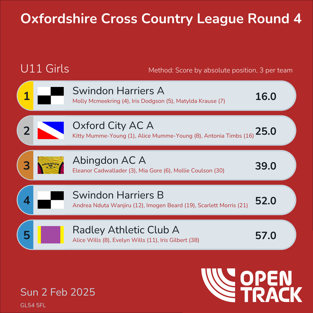 | 12 | GMILT-A | 100.0 | 23: Alice Mosley (23), 28: Emma Bingham (28), 49: PENALTY SCORE (49) | |
