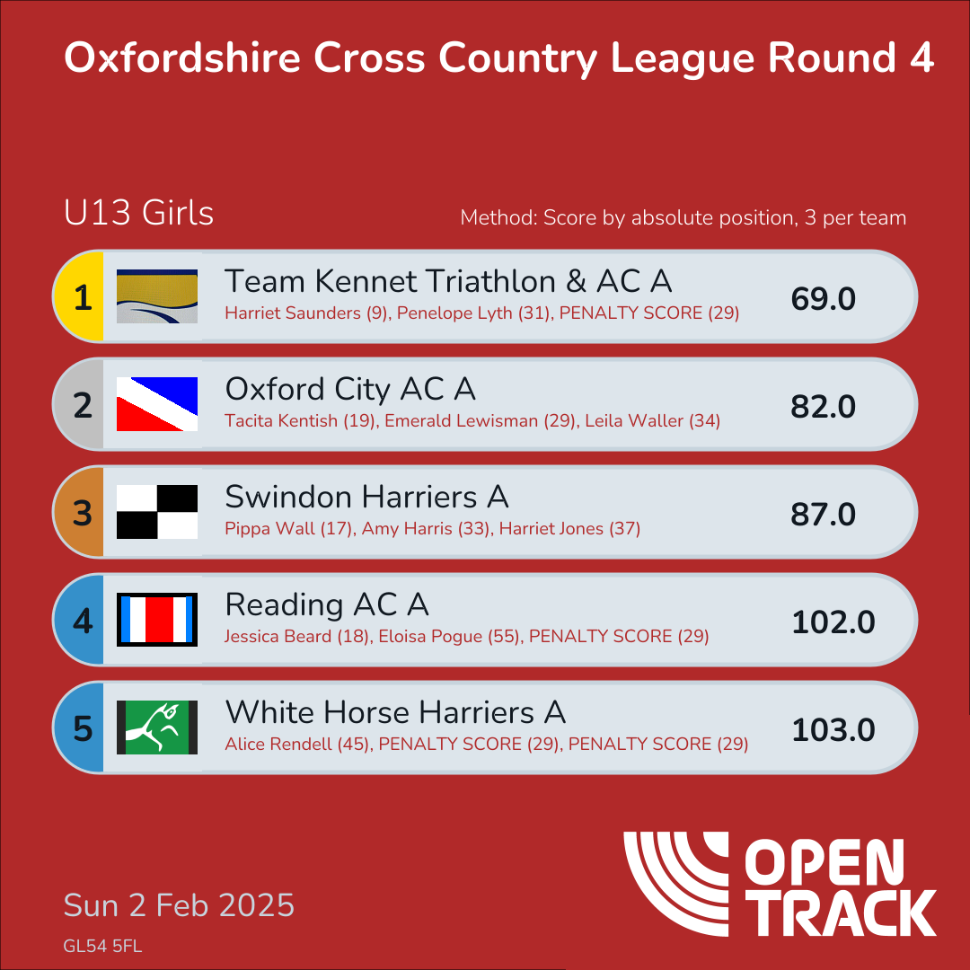 | 1 | TKTRI-A | 69.0 | 9: Harriet Saunders (9), 31: Penelope Lyth (31), 29: PENALTY SCORE (29) | |