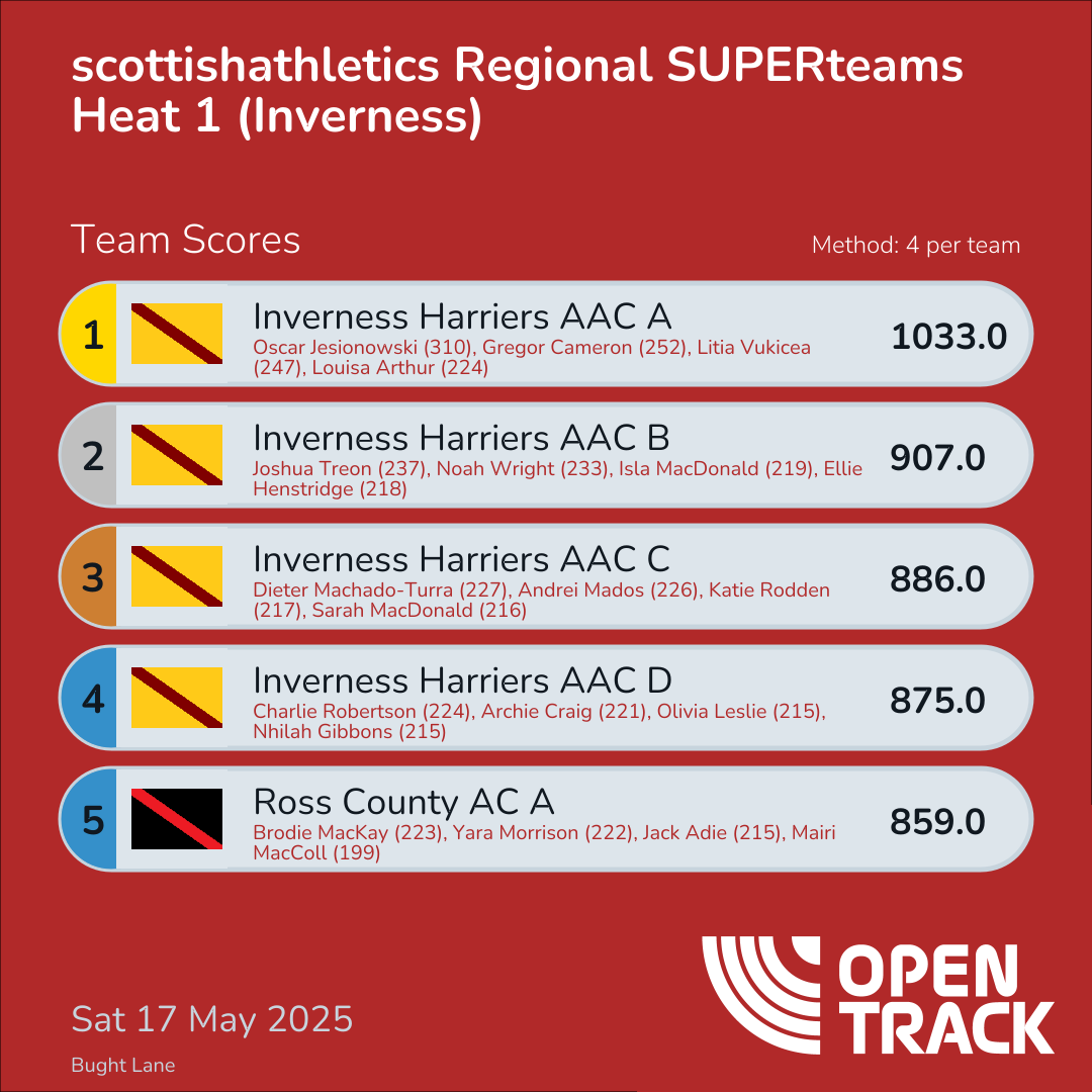 859.0 | 11: Brodie MacKay (223), 12: Yara Morrison (222), 21: Jack Adie (215), 28: Mairi MacColl (199) | |