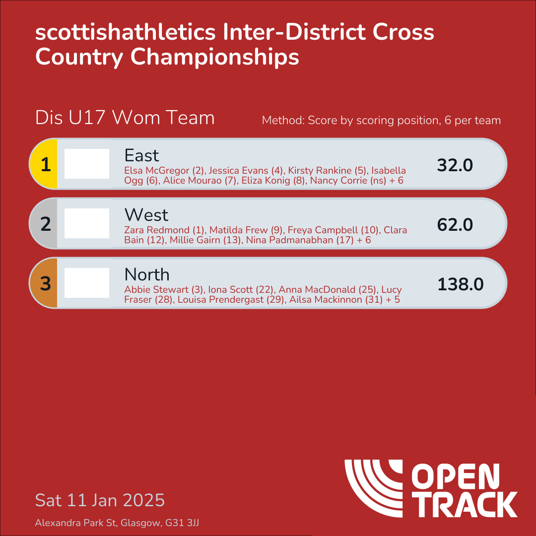 62.0 | 3: Zara Redmond (1), 22: Matilda Frew (9), 23: Freya Campbell (10), 25: Clara Bain (12), 26: Millie Gairn (13), 32: Nina Padmanabhan (17) | |